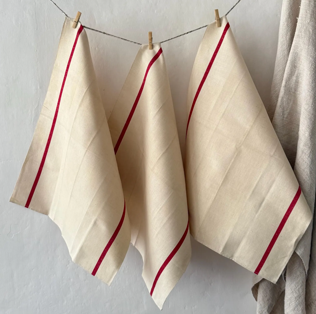 Set of 3 fine quality French vintage 'Fleur Bleue' linen / cotton torchons, a solid red stripes down each side, a loop to hang.
