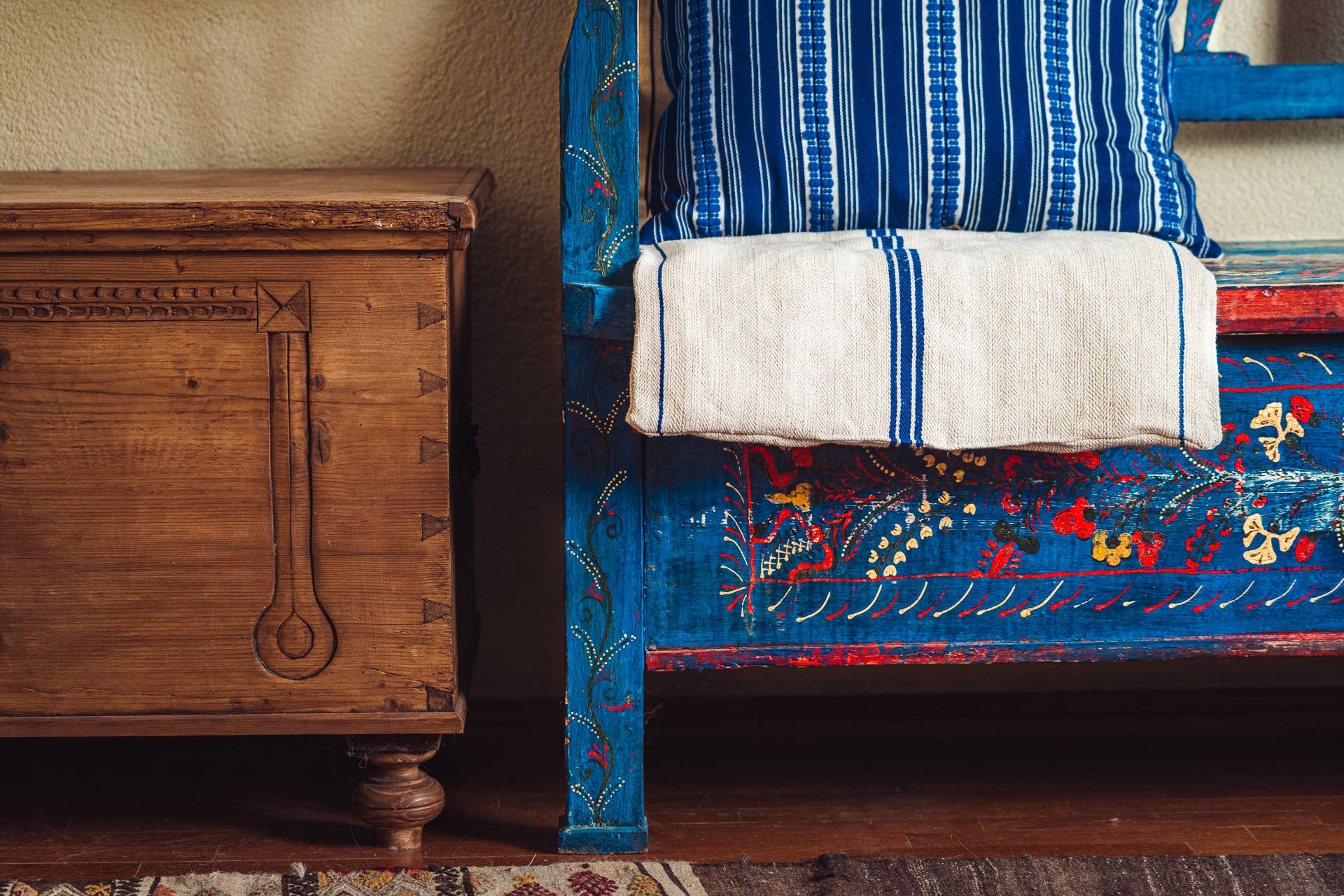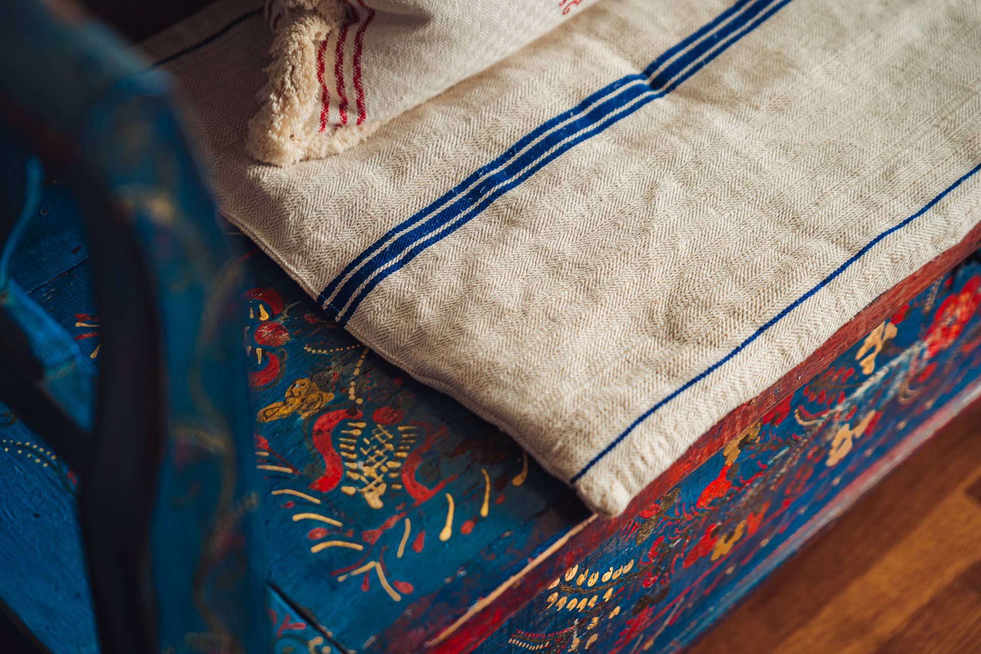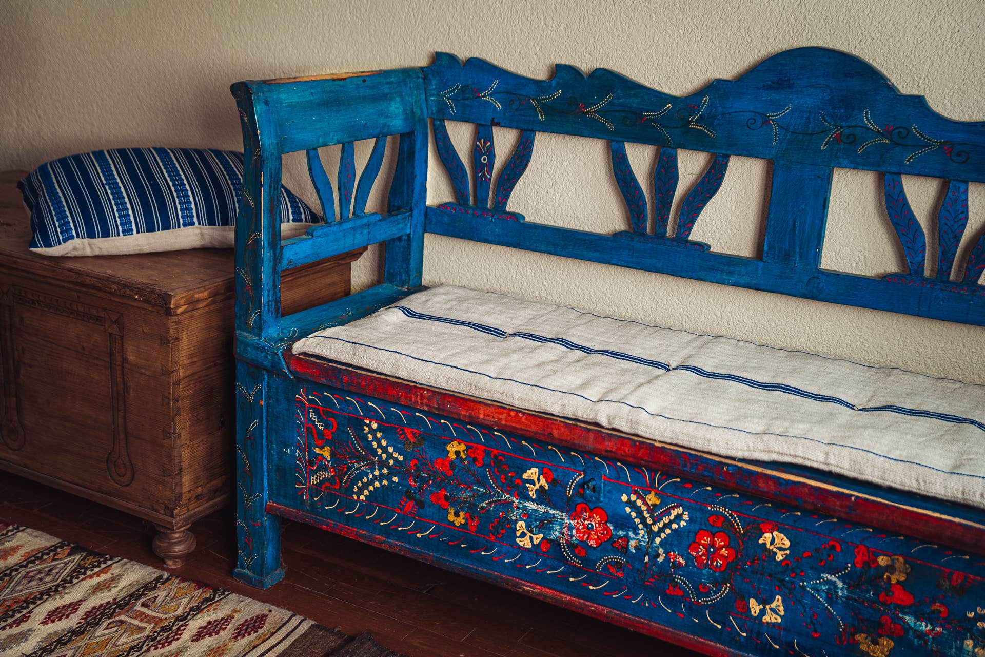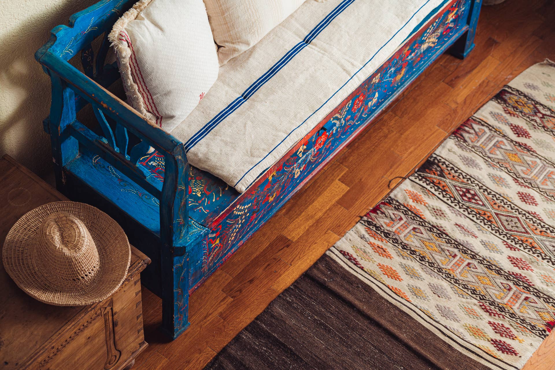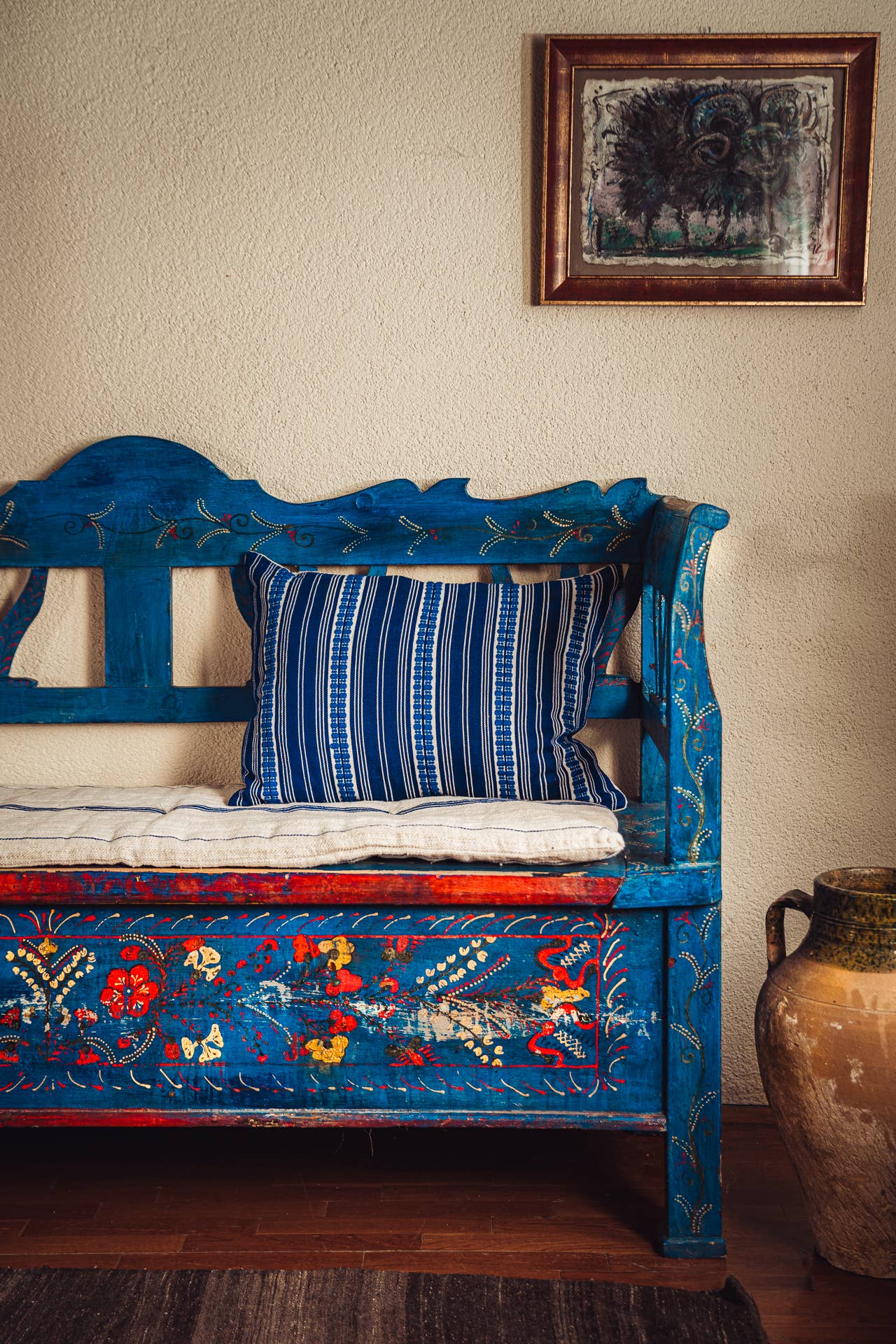 Hand crafted bedroll, couch topper or big cushion, up-cycled using antique hand woven hemp grain sack. Natural cotton insert.